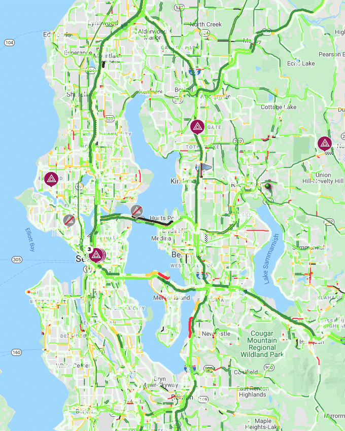 At 7:30 AM average travel speeds were more than 10 MPH faster on the major highways in the Seattle Metropolitan area, with the greatest improvements unsurprisingly occurring on I-5 and I-405 which run through Seattle and Bellevue. These are two of the most heavily trafficked corridors to reach Amazon’s headquarters in South Lake Union and Microsoft’s offices in Redmond. Both cross-lake routes, I-90 and SR-520 also showed significant increases in average travel speeds. Light green corresponds to an improvement in travel speeds of 5-10 MPH, while dark green corresponds to average speeds greater than 10 MPH. Based upon the trend line established Monday, drivers were witnessing free flow conditions during peak hours, or speed improvements of 15-20 MPH.
