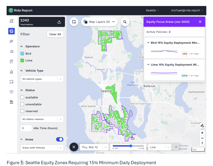 Many agencies specify minimum deployment rules—either as a percentage of daily fleet, a minimum number of devices per equity zone, or a minimum number of vehicles placed within a defined geography. The goal is straightforward: ensure baseline availability where the market wouldn’t necessarily optimize on its own and/or where transportation has been historically underserved. Some examples include:
