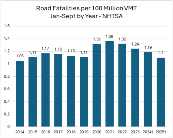 This means that on a per-mile basis, traffic fatalities are lower than at any time in the last decade, even though the number of fatalities remains higher than 2019 levels.