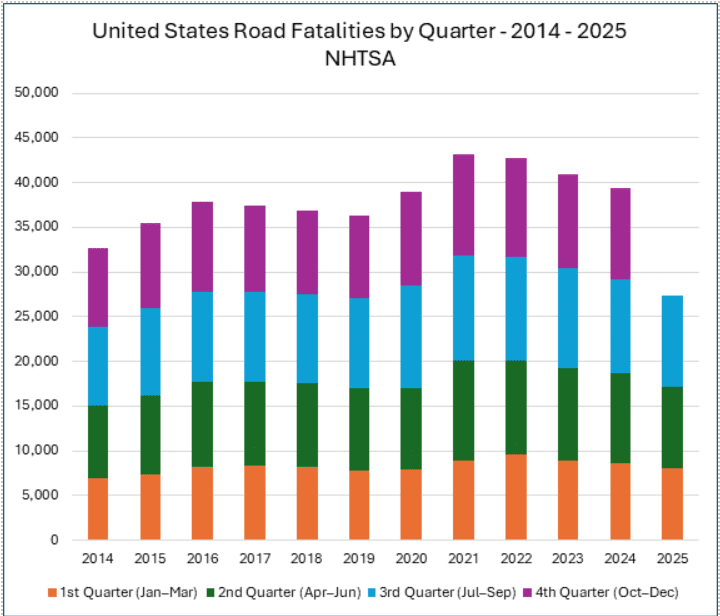 For example, from 2014-2024, Q2 to Q3 growth rates averaged 9%, even with the rapid 24% spike in 2020. Yet in 2025, Q2 to Q3 fatalities grew at 13%. This suggests that traffic fatalities may be trending upward from earlier in the year, though they still may end lower for the year overall.