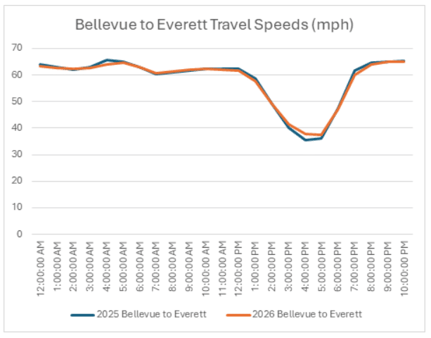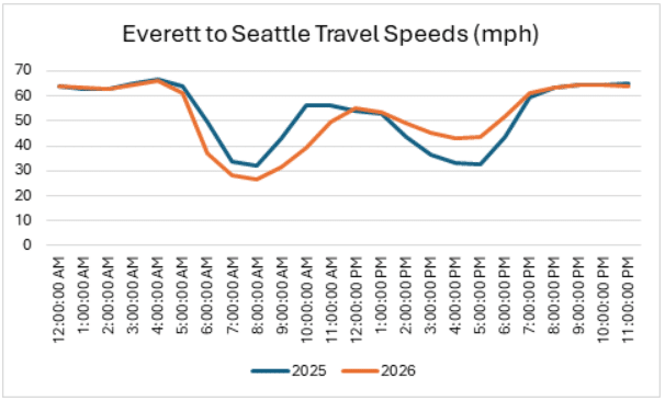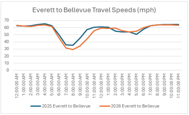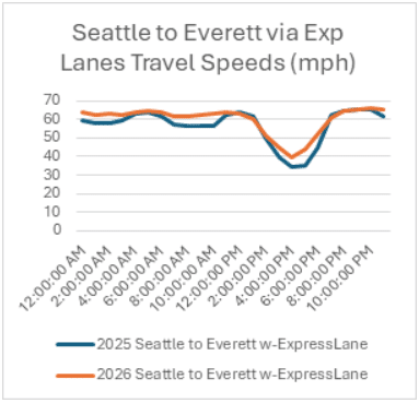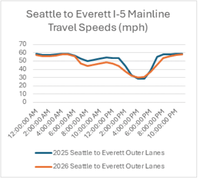 In contrast, northbound I-5 travel during the evening commute has remained close to 2025 levels. The primary reason is the I-5 Express Lanes remaining northbound throughout the day. During the peak afternoon commute period, the express lanes are moving 27% faster, while the I-5 mainline is moving 8% faster. This consistency highlights how directional lane management continues to benefit northbound travelers in the evening.