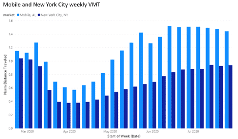 New York City’s population is 8.4 million, while the population of Mobile, Alabama is 190,000. Despite the population and geographic differences, they share a common VMT growth pattern. Both cities have increased by more than 250% since their lowest point in April. While they share similar grow patterns, Mobile has surpassed its pre-COVID VMT experienced in March, while New York has yet to reach their pre-COVID VMT levels.Looking at the five cities that gained the most in VMT, we see that four of them increased at a steady state from the middle of April through June. During July, these cities began to plateau. Mobile, Alabama had a steep increase in VMT through the end of May, dropping again the first week of June before reaching 250%. Since then, it has fallen to the other four counties’ VMT.